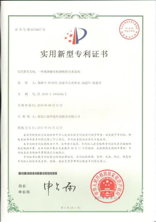祝贺公司荣获由国家知识产权局授权的“一种无动力农村污水处理装置”实用新型专利证书,专利号为:ZL 2016 2 0989756.8 ;“一种难降解有机物吸附分离系统”实用新型专利证书,专利号为:ZL 2016 2 1002444.x 。