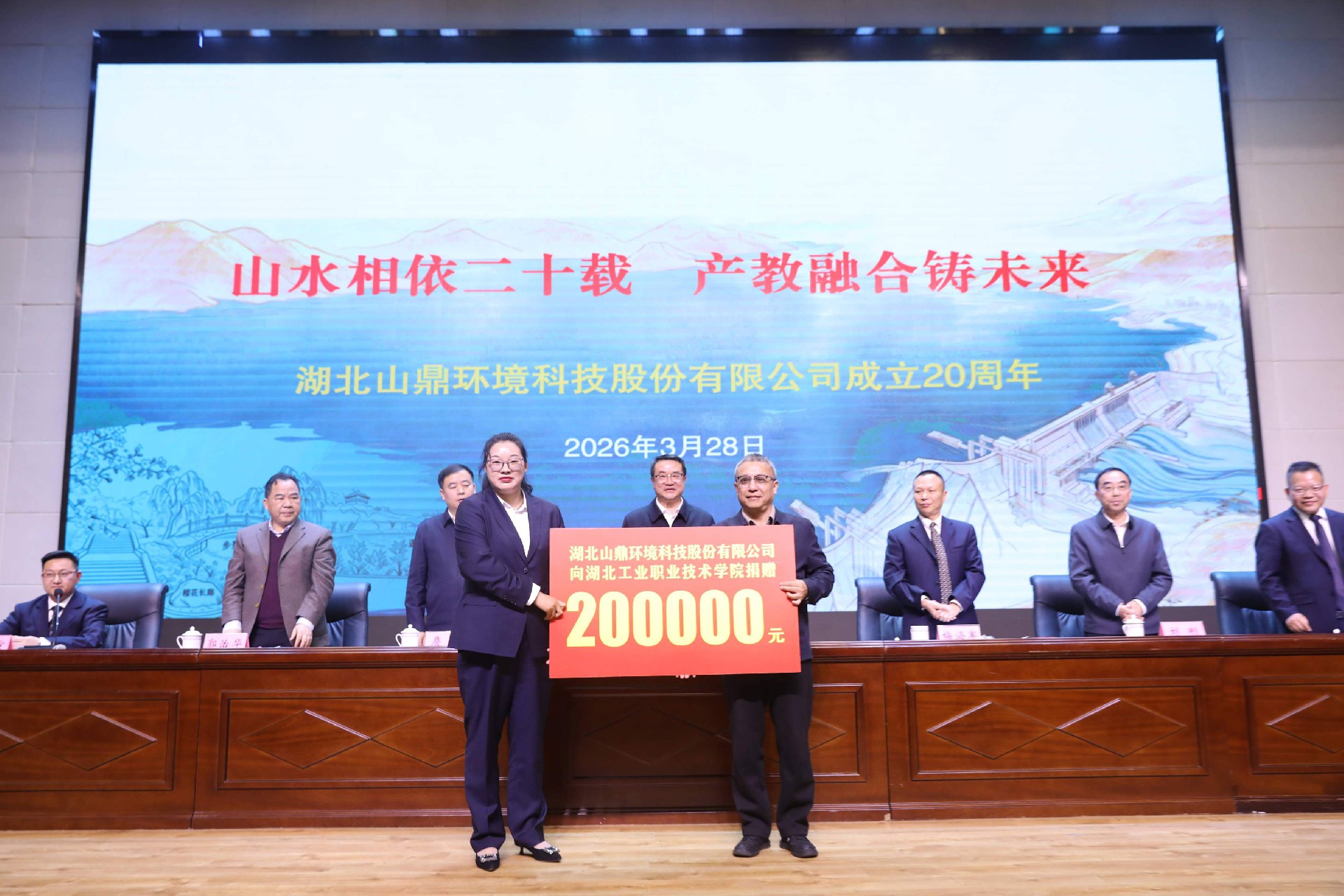本次活动以 “山水相依二十载,产教融合铸未来” 为主题,旨在总结公司成立 20 年来的发展成就,尤其是公司特色的产学研一体化模式建设成果,展望未来。会前,与会嘉宾共同观看公司成立 20 周年宣传视频;会上,依次举行捐赠与授牌、优秀企业教师颁奖、资深员工颁奖等仪式,湖北工业职业技术学院、湖北水发集团十堰公司及客户代表先后致辞,公司董事长致答谢词。